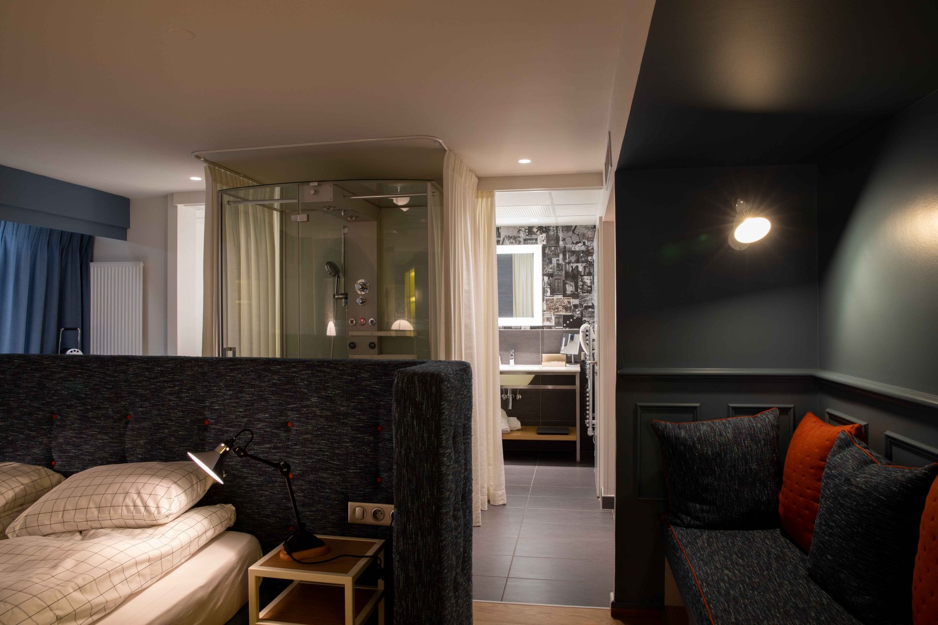 Dieses atypische Zimmer mit großer Fläche, im Halbparterre mit Blick auf den Innenhof des Hotels enthält ein Doppelbett, einen Relax-Bereich mit Entspannungssessel und einen markanten Bürobereich, der die großen Fenster unterstreicht, die das Zimmer schön hell machen.